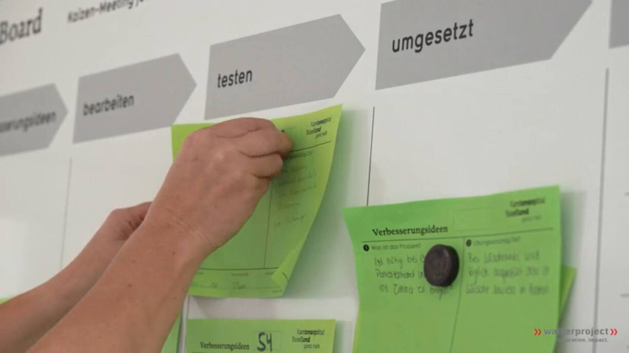 Für das Management von Kaizen braucht es einen Haltungswechsel und strukturiertes Vorgehen. Die eingegangenen Ideen werden regelmässig an Kaizen-Meetings gesichtet und nach Aufwand und Wirkung priorisiert. Die eingereichten Ideen befinden sich am Kaizenboard, wo sie in den verschiedene Phasen der Umsetzung visualisiert werden: eingereicht, bearbeiten, testen, umgesetzt. Pro Verbesserungsidee wird eine verantwortliche Person festgelegt, die jeweils die Fortschritte vorantreibt und dokumentiert.